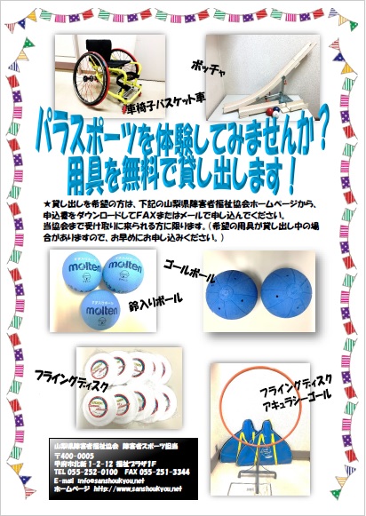 山梨県障害者スポーツ協会では、障害者用のスポーツ用具の貸し出しを行なっています。